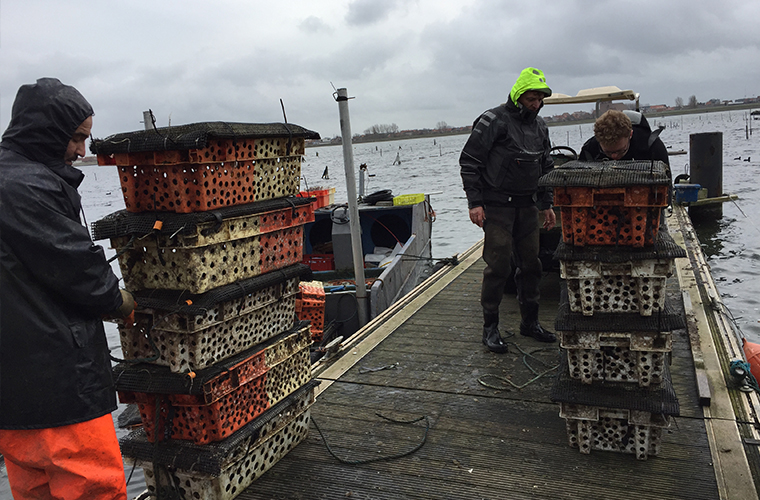 Tijdens het groeiproces is het sorteren van de oesters een belangrijk werk. Sorteren naar grootte maar ook triage van dode/slechte schelpen en levende.